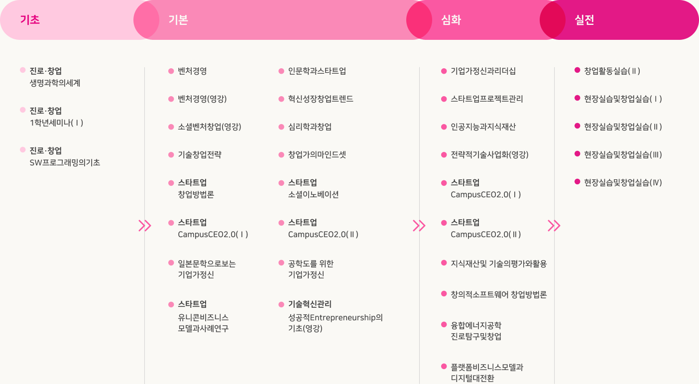 실전적인 창업 역량 교육 강화를 통해 도전적이고 혁신적인 기업가 정신에 대한 깊이 있는 이해, 창업가로 성장하기 위한 능력 함양을 위해 단계별로 습득할 수 있는 창업교과 로드맵 제시